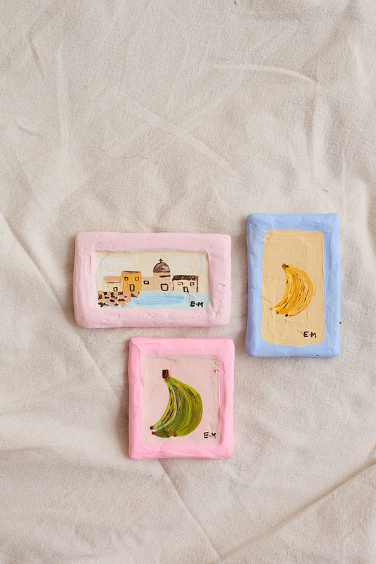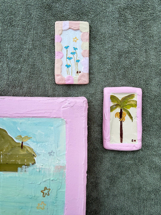 Mini hand plastered backgrounds and painted using Acrylic paint and oil pasel. All artworks are originals by Ella Martin.